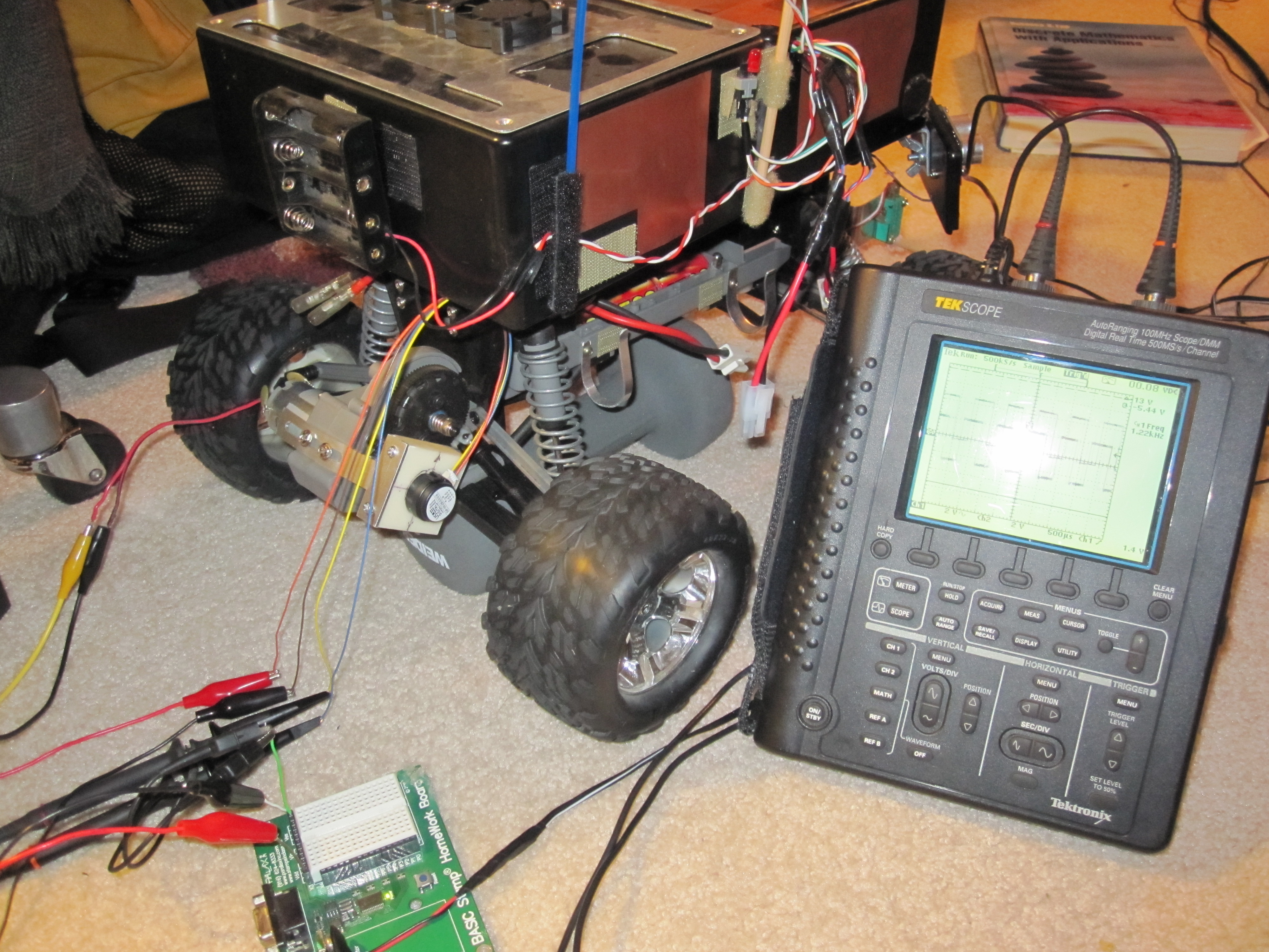 The EVErobotics Robo-Magellan entrant is built on a Traaxxas Stampede 1/10th scale electric truck frame. We were able to reuse the stock speed controller and steering servo by substituting the radio receiver module's control signals with pulse-out signals output by a micro-controller. The control signals consist of 50 Hertz positive TTL pulses of between 1mS and 2mS with 1.5mS as null for both steering and throttle.