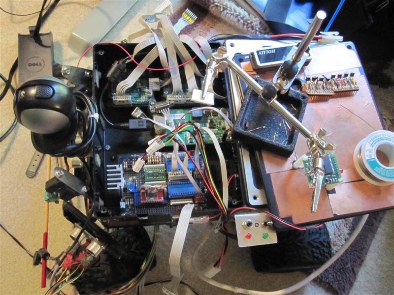 The micro-controllers used in the robot are two Coridium ARMmite Pro single board programmable controllers. The ARMmite is programmable in C or BASIC. One controller (the platform controller) is used to manage the sonar sensors, IR rangefinders, bumber switches, and control throttle, brake, and steering.  We use the other one (the navigation controller)  to process data from the electronic compass, optical encoder, GPS module, and accelerometer. Lastly, we have integrated an Acrosser AR-B5230 embedded computer into the design. The computer is directly connected to the web camera and also processes data from all of the sensors to form a map of the robot's environment. The computer also serves as an embedded development platform for its own software as well as the attached peripheral controllers, and as a means for remote control and/or remote monitoring of the robot via bluetooth.