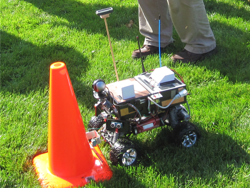 Robots must touch bonus waypoint cones (but not move them or knock them over) to score bonus points. Robots must touch the destination waypoint and stop in order to complete the course. Robots that do not complete the course will receive no score for that round (see exception under Scoring). Other than GPS, robots cannot use external beacons or markers as navigation aids, nor can robots employ devices like differential GPS to boost the accuracy or reception of GPS signals.