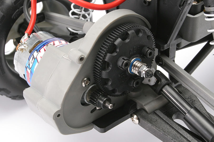 We replaced the stock electric motor with a gear motor, P/N: MP-28005-385 sold by BaneBots to achieve a gear reduction of 5:1 for constant torque and low speed at optimum motor rpm. The stock drive train configuration gives the truck a 30 mph top speed! We want less than 10 mph. The pinion gear had to be bored out from 3mm to 6mm to accommodate the larger diameter gear motor shaft.